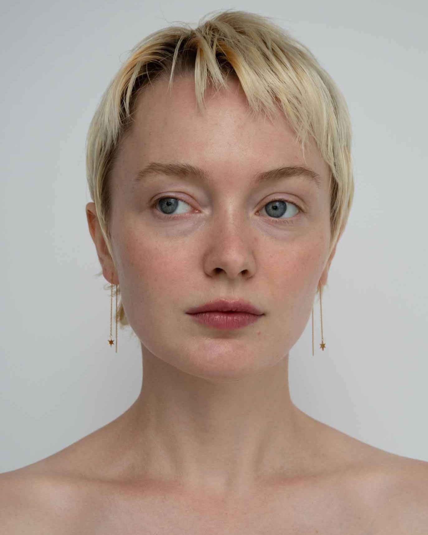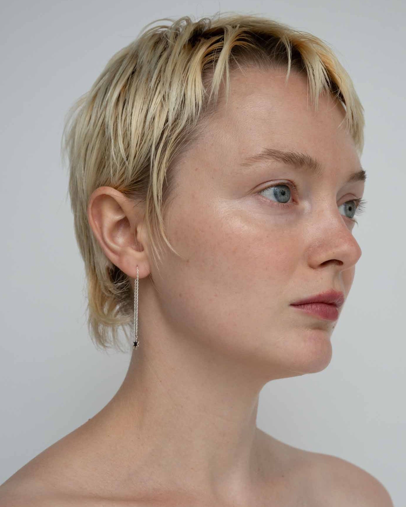 ピアスホールに直接通すタイプのチェーンピアス。先端にはスパークリングワインの泡の輝きをイメージしたモチーフをあしらっています。